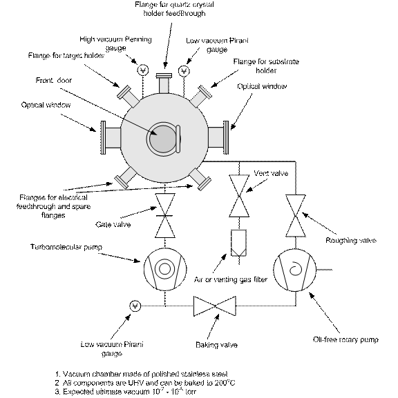 Quartz crystal monitor: with one shuttered sensor, UHV feed through, sensors kit UHV quick access door 8" with view port UHV silica view ports 6" (uncoated) Moveable (rotating, tilting) target and substrate holders General controller (water, compressed air, power distribution, etc.)
