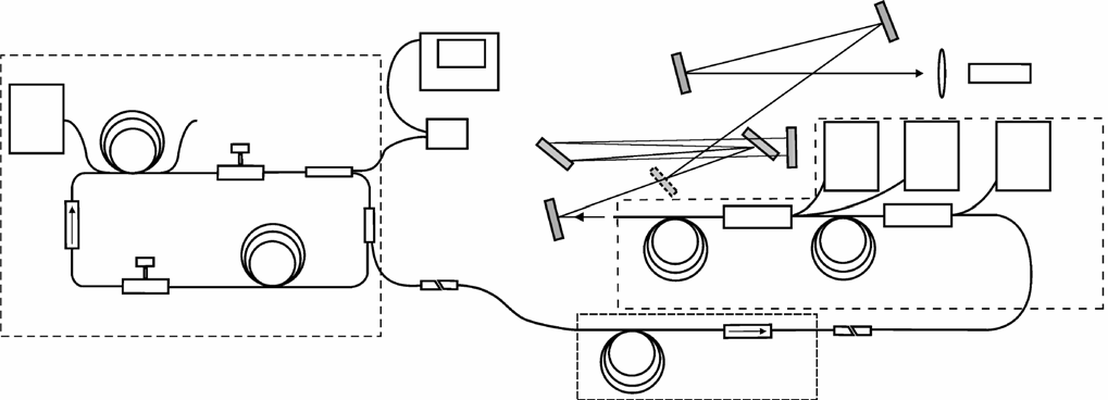 A ring Yb doped fiber laser in which the mode locking is based on the nonlinear polarization rotation serves as the master oscillator with normal total dispersion and an increased cavity length, which provides a decrease in the pulse repetition rate [17]. For pumping, we employ a diode laser with an output power of up to 10 W at a wavelength of 976 nm with a fiber output that allows the pumping of double clad active fibers. The laser cavity contains the following fiber elements: active Yb GTWave fiber with a core diameter of 7 μm and an inner cladding diameter of 105 μm [18], polarization beam splitter, polarization maintaining 50% beam splitter, Faraday isolator, two polarization controllers, and an additional fragment of fiber for a decrease in the pulse repetition rate. Thus, the laser has two outputs in which the radiation is linearly polarized.