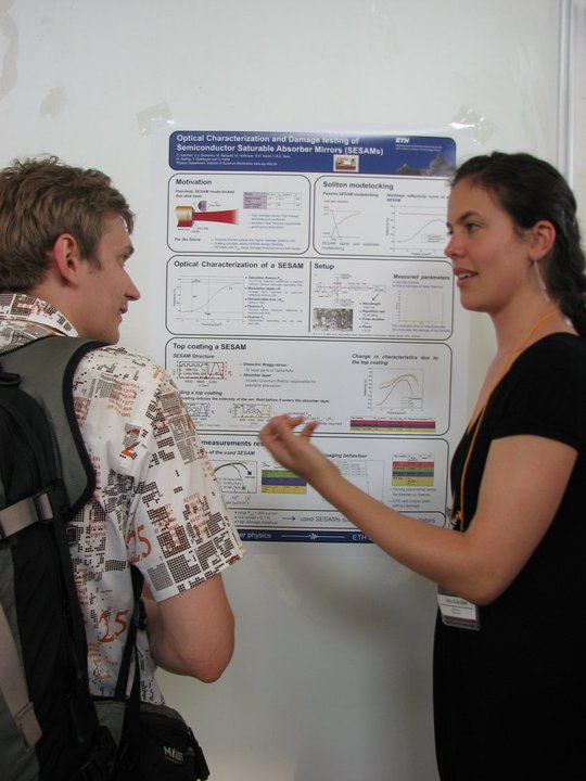 Cinia Schriber, from ETH in Zurich presents her award winning poster "Optical Characterization and Damage Testing of Semiconductor Saturable Absorber Mirrors (SESAMs)" Cinia receives Best Poster Award sponsored by Del Mar Photonics, from the IONS Moscow conference organizers Desiré Whitmore and Zuleykhan Tomova, Head of IONS-8 / Moscow |