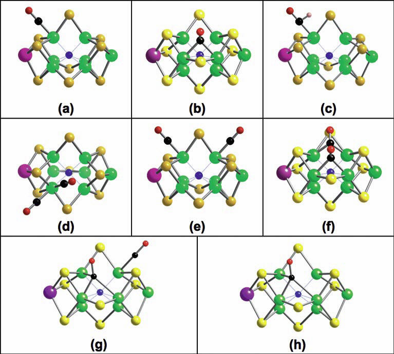 ligands and cysteine thiolate ligand of Fe-1 have been omitted for clarity. No attempt was made to relax the Fe-S framework for these structures. Atom color codes: Fe green, Mo purple, S yellow, C black, O red. The undefined central atom of FeMo-co is printed in blue.