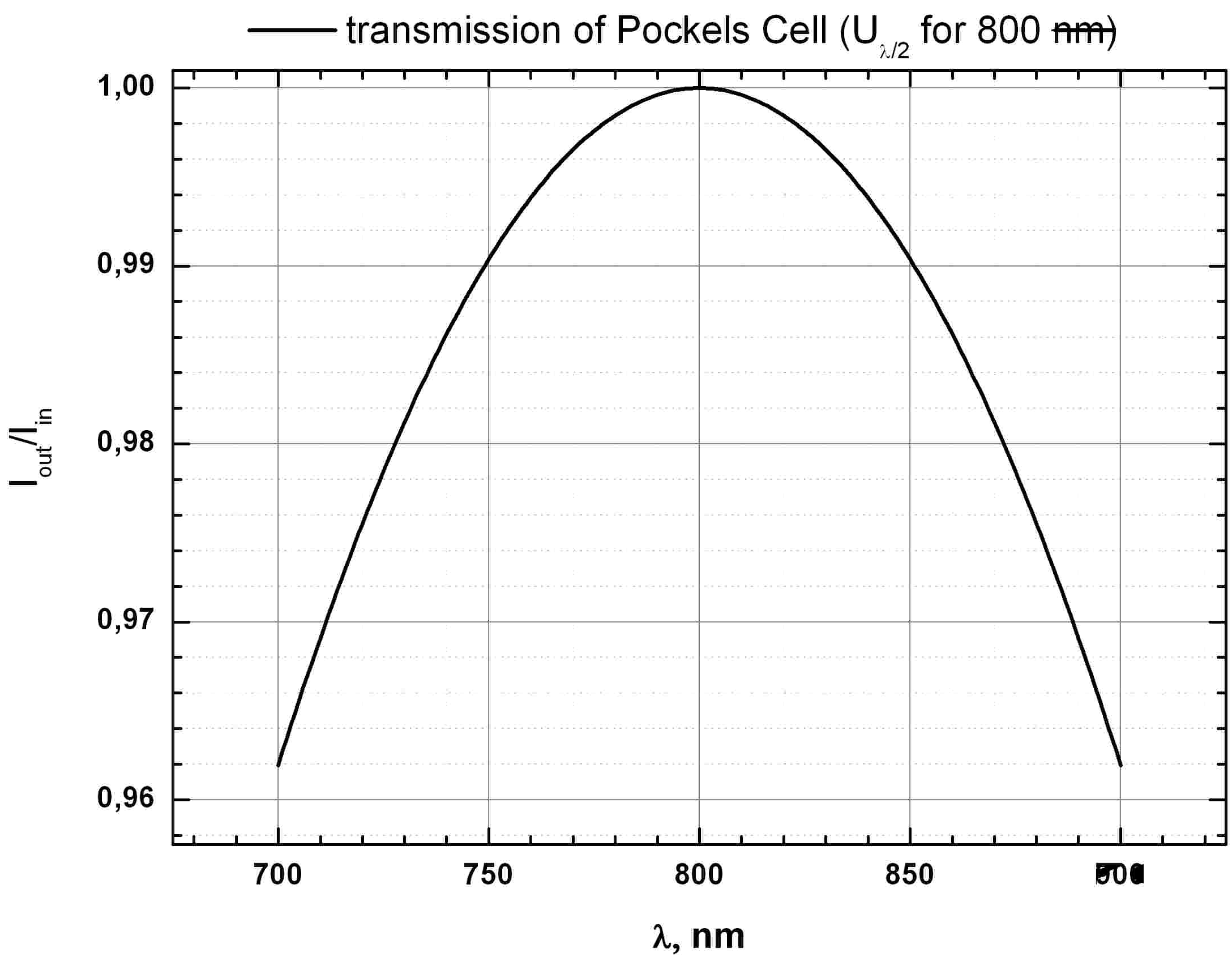 The transmission of Pockels cell is shown below. It's about 3.5 % smaller at the edges of the range then at the central wavelength. The reflectivity of ARC