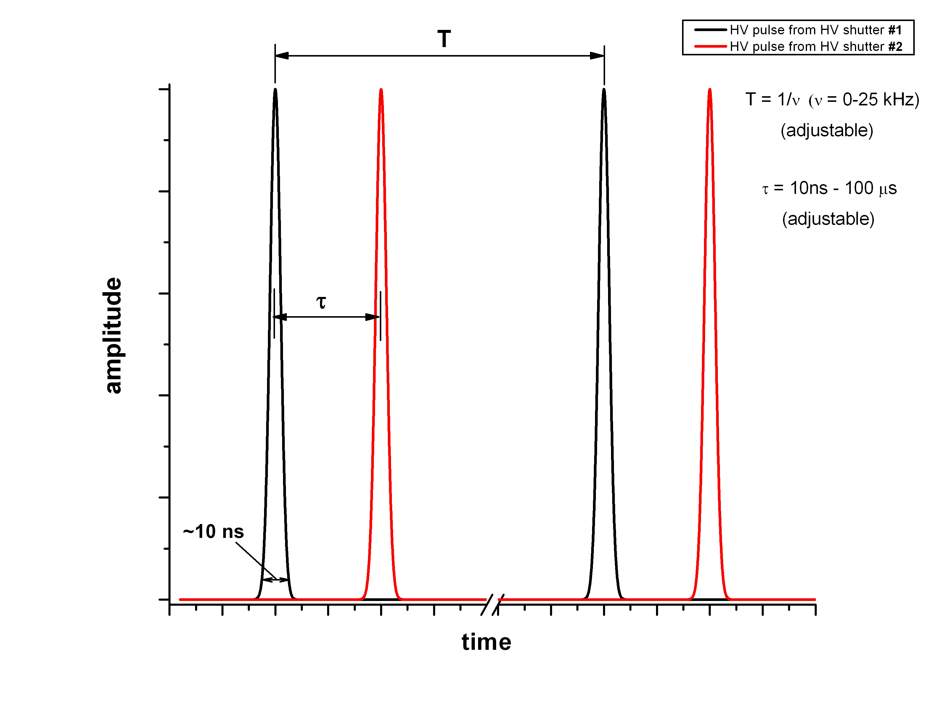 Pismo OG8/25-2 has one Pockels cell based on DKDP crystal and two independent high voltage shutters. Each of HV shutters generates bell-shaped HV pulse with amplitude in the range 6-9 kV (halfwave voltage for DKDP is ~8 kV at 800 nm) and duration ~10 ns at level 10% of maximum amplitude. Maximum repetition rate of each HV shutter is 25 kHz (adjustable from 0 to 25 kHz). The delay between HV pulses can be varied in the range from 10 ns to 100 microseconds (or more, if required).