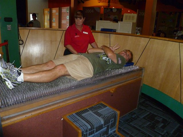 Sergey Egorov laying on the bed of nails in the Discovery Science Center in Santa Ana, CA